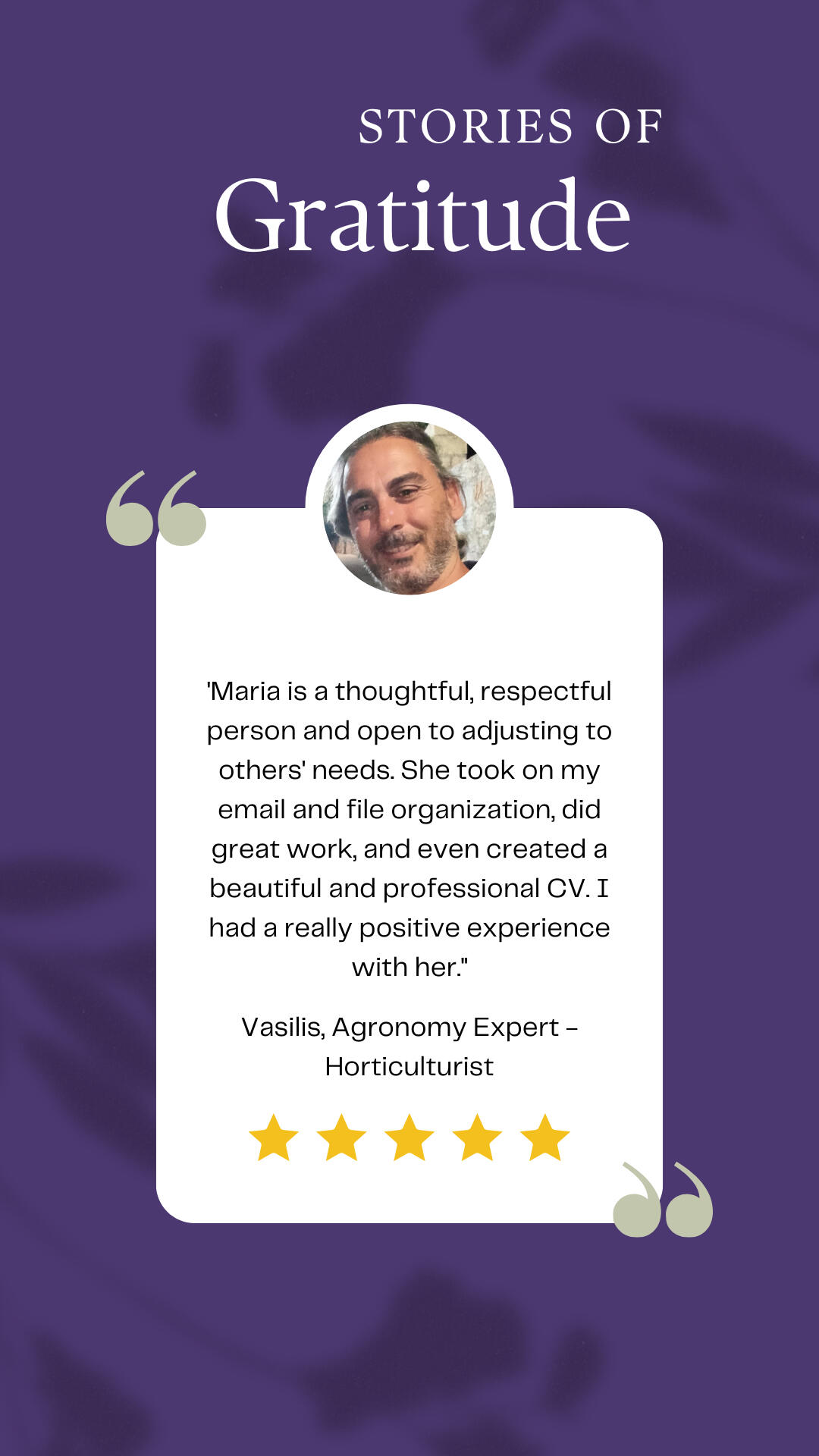 As a multilingual virtual assistant fluent in Greek, Spanish, and English, I facilitate seamless communication across diverse languages, enabling you to connect with global audiences and unlock new opportunities for your business.
